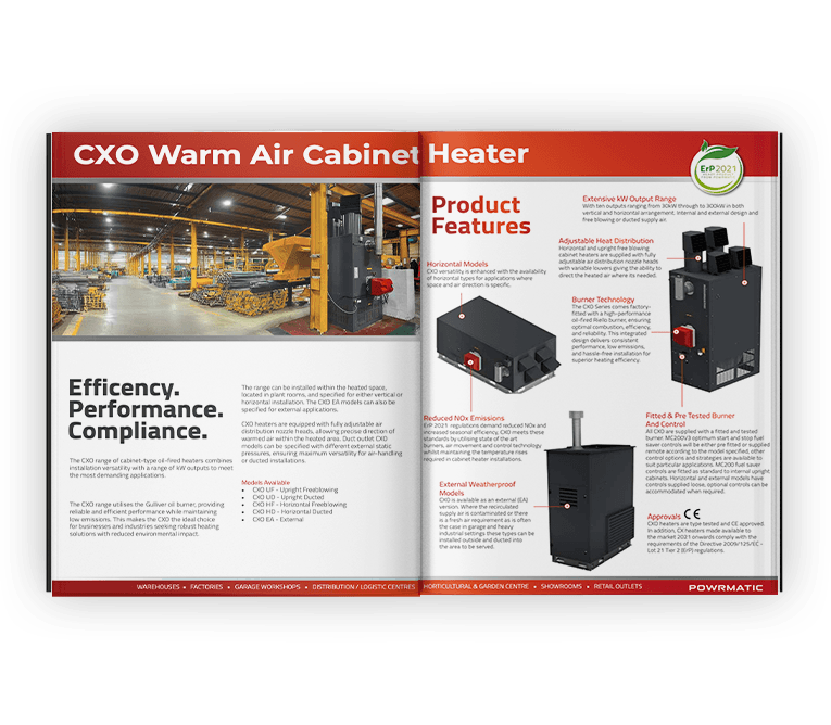 The CXO range of cabinet-type oil-fired heaters combines installation versatility with a range of kW outputs to meet the most demanding applications. The CXO range utilises the Gulliver oil burner, providing reliable and efficient performance while maintaining low emissions. This makes the CXO the ideal choice for businesses and industries seeking robust heating solutions with reduced environmental impact.